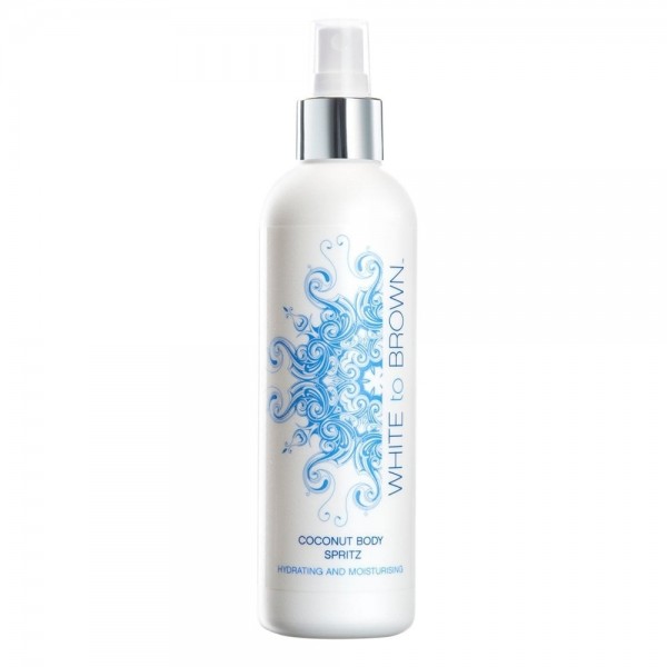 White to Brown Coconut Body Spritz Keep your tan glowing for longer with the hydrating Coconut Body Spritz from White to Brown. The perfect accompaniment to the Self Tanning Water, this refreshing body spray is enriched with coconut extract, aloe vera and cocoa butter to deeply nourish the skin and prolong tan. White to Brown Body Spritz leaves a delicate, yet lasting, coconut scent - a summer must-have!
